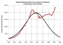 In 1971, Hubbert revised his peak gas estimate based on updated reserve information. He revised his estimated ultimate recovery upward to 1,075 trillion cubic feet (30,400 km3) for the lower 48 states only, and predicted: "For natural gas, the peak of production will probably be reached between 1975 and 1980."[30] Gas production for the lower 48 states did peak in 1979, and declined for several years, but rose again, and once more Hubbert's assumed EUR of 1,075×1012 cu ft (30,400 km3) proved to be too low, as actual lower 48 state production from 1936 through 2012 has already exceeded 1,265×1012 cu ft (35,800 km3), 18% higher than the estimated EUR of 1,075.[31]