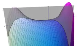 The function whose graph is the surface takes positive values between the two parabolas and , and negative values elsewhere (see diagram). At the origin, the three-dimensional point on the surface that corresponds to the intersection point of the two parabolas, the surface has a saddle point.[6] The surface itself has positive Gaussian curvature in some parts and negative curvature in others, separated by another parabola,[4][5] implying that its Gauss map has a Whitney cusp.[5]