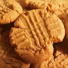 A peanut butter cookie is a type of cookie that is distinguished for having peanut butter as a principal ingredient. The cookie originated in the United States, its development dating back to the 1910s.[1] If crunchy peanut butter is used, the resulting cookie may contain peanut fragments.