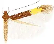 Male, female. Forewing length 2.9 3.8 mm. Head: frons shining ochreous-white with greenish and reddish reflections, vertex and neck tufts shining bronze brown with greenish and reddish reflections, collar shining bronze brown; labial palpus first segment very short, white, second segment four-fifths of the length of third, dark brown with white longitudinal lines laterally and ventrally, third segment white, lined brown laterally; scape dorsally shining dark brown with a white anterior line, ventrally shining white, antenna shining dark brown, with a white line from base to two-thirds, followed towards apex by six to eight white segments, two dark brown, two white, ten dark brown and about seven white segments at apex. Thorax and tegulae shining bronze brown with reddish reflection, thorax with a white median line. Legs: femora of midleg and hindleg shining pale ochreous, foreleg brownish grey with a white line on tibia and tarsal segments, tibia of midleg brownish grey with white oblique basal and medial streaks and a white apical ring, tarsal segment one and two with an ochreous-white streak, tarsal segment four with a white apical ring, segment five ochreous white, tibia of hindleg brownish grey with a white, very oblique streak from base to beyond middle and a white apical ring, tarsal segment one with whitish basal and apical rings, segments two and three with whitish apical rings, segments four and five entirely whitish, spurs ochreous-white. Forewing shining bronze brown, five narrow white lines in the basal area, a first subcostal from base to one-quarter and slightly bending from costa, a short second subcostal in the middle between the end of the first subcostal and the transverse fascia, a medial from before the middle of the first subcostal to one-third and just above fold, an oblique subdorsal from before the end of the medial to beyond the end of the second subcostal, a short dorsal from beyond base to one-fifth, a light yellow transverse fascia beyond the middle with a broad prolongation towards apex and with a narrow apical protrusion, bordered at the inner edge by two tubercular pale golden metallic subcostal and dorsal spots, the subcostal spot with a patch of blackish scales on the outside and more towards base, two tubercular pale golden metallic costal and dorsal spots at three-quarters of the transverse fascia, both spots opposite, the costal spot lined brown at the inside, the dorsal spot more towards base and twice as large as the costal, a white costal streak from the outer costal spot, a shining white apical line from the apical protrusion of the transverse fascia to apex, cilia bronze brown around apex, paler towards dorsum. Hindwing shining brownish grey, darker grey in the female, cilia pale brown. Underside: forewing shining ochreous-grey with greenish reflection, apically lighter, the apical line visible, hindwing slightly paler than forewing. Abdomen dorsally shining dark greyish brown, segments six and seven each with a narrow ochreous-white posterior band, laterally ochreous-white, ventrally shining white, anal tuft ochreous-white dorsally, white ventrally.[1]