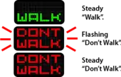 Regardless of whether pictograms or words are used, the MUTCD defines a steady "upraised hand" or don't walk signal as an indication that a pedestrian cannot enter the street in that signal's direction, while a steady "walking person" or walk indicates that pedestrians can start crossing the street toward that signal.[9] The upraised hand or don't walk signals begin to flash during the pedestrian clearance interval when the transition to the "don't walk" phase of the signal is imminent.[9] This normally occurs several seconds before the light turns yellow, usually going solid orange when the traffic light turns yellow or red; however, the display can be turned into a steady hand or "don't walk" sign while the vehicular light is yellow, or while the vehicular signal is still displaying a green light.[45] In intersections with "leading pedestrian intervals," the upraised hand or "don't walk" sign will continue flashing as the vehicular lights turn red and the other crossing(s) in the intersection display a walking person or "walk" sign. The vehicular traffic is then stopped in all directions for a short period of time before cross traffic is allowed to proceed.[46] The 2009 MUTCD states that the flashing walking person or "walk" signals do not have meaning.[9] The "flashing walk" indication was formerly used to delineate "watch out for turning vehicles"[47] and is still in use in Washington, D.C.;[48] however, as of the 2003 MUTCD, this was replaced by an optional "animated eyes" indication within the pedestrian signal display,[49][50] which was placed in the MUTCD following a study that recommended the usage of the "animated eyes" signal.[51]