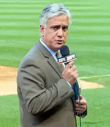 Gomez gained much experience during this seven-year period as a newspaper writer. His work in Sacramento, San Jose and later as a national baseball writer and general sports columnist for The Arizona Republic in Phoenix from 1997 to 2003 led to ESPN's hiring of him in 2003 to work at SportsCenter.[6] Gomez specialized in baseball reporting for ESPN[8] and followed Barry Bonds for the better part of three seasons as Bonds pursued Hank Aaron for the all-time MLB home run record.[1] Gomez's favorite event that he covered was Game 6 of the 2003 National League Championship Series, when Chicago Cubs fan Steve Bartman attempted to catch a foul ball against the Miami Marlins, who went on to score eight times in the inning.[7] In 2016, Gomez went to Cuba to cover an exhibition game between the Tampa Bay Rays and the Cuban national team, the first visit by an MLB club in almost two decades.[9] He also appeared on Baseball Tonight and other studio shows.[3]