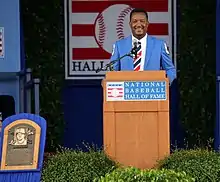 Officially listed at 5 ft 11 in (1.80 m) and 170 pounds (77 kg), Martínez was unusually small for a modern-day power pitcher, and is believed to have been somewhat smaller than his officially listed height and weight.[7][8] In his early 30s, injuries began to keep him off the field to an increasing extent, with his appearances and success dropping off sharply, in his final seasons. Modern sabermetric analysis has strongly highlighted Martínez' achievements; his WHIP is the lowest of any live-ball era starting pitcher, his adjusted ERA+ is the best of any starting pitcher in major league history,[9] and he has the third-highest strikeout-to-walk ratio in modern history. He dominated while pitching most often in a hitter-friendly ballpark and facing some of the toughest competition during the steroid era, which is generally thought to have favored batters.[10][11][12][13] His dominance, reflected by modern statistics, has led many to consider Martinez as one of the greatest pitchers in MLB history.[14] He was elected to the Baseball Hall of Fame in 2015 in his first year of eligibility, joining Juan Marichal as the second Dominican to be enshrined; his number (45) was retired by the Red Sox in a ceremony, two days after his Hall induction.[15]
