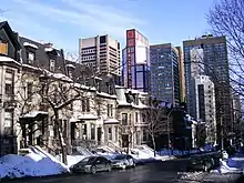 Inaugurated on August 23, 1854, Peel Street was named after Sir Robert Peel (1788-1850), the former Prime Minister of the United Kingdom.[1] Peel Street was originally a quiet residential street in the Golden Square Mile.[2] Until 1959, Peel was known as Colborne Street south of Notre-Dame Street. Until 1968, the street was known as Windsor Street south of Dorchester Boulevard (today René Lévesque Boulevard).[3]