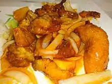 Peking Pork (Chinese: 京都排骨; pinyin: jīngdūpáigǔ) is a meat dish that is a mistranslation. The name in Chinese means "Capital Rib," a name that is more common in Taiwan and overseas than in Mainland China itself. Its reference to Beijing, China is a misnomer. The dish actually refers to sweet and sour style of rib, which originated from Wuxi as Wuxi Fried Spare Ribs and then popularized overseas through Cantonese restaurants. The capital refers to the Nanjing capital, an area where sweet and sour cooking originated in China. This dish consists of crisp pork ribs that are marinated in a sweet red sauce. The pork should be firm and crisp, with a slightly sweet glaze that does not overwhelm the tenderness of the pork. Found in many Chinese and dim sum restaurants in Chinatown, this rare dish is not common in many Chinese restaurants elsewhere. [1]