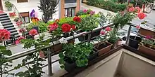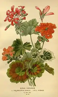 Pelargonium × hortorum, commonly called zonal geranium,[2][3] or garden geranium, is a nothospecies of Pelargonium most commonly used as an ornamental plant. It is a hybrid between Pelargonium zonale and Pelargonium inquinans. They are the group of Pelargonium cultivars, with leaves marked with a brown annular zone and inflorescence in the form of large balls of tight flowers, usually red, pink, or white. These are the most common geraniums of garden centers and florists, sold in pots for windowsills and balconies or planted in flowerbeds.