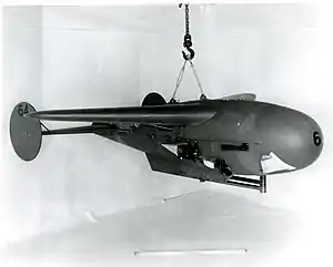 Two versions of Pelican were developed; one used a 1,000-pound (450 kg) bomb as its basis, named Pelican Mark II, while the other used a 1,500-pound (680 kg) bomb and was referred to as Pelican Mark III. Both had a high-mounted wing, with a twin-fin empennage providing stabilization and control. The semi-active radar seeker head was designed for use with the AN/APS-2 radar carried in the Lockheed PV-1 Ventura; the PV-1 could carry two Pelican Mark IIs or a single Pelican Mark III.[2] While Pelican required its launching aircraft to continue illuminating its target with its onboard radar following launch, compared to the Bat which carried its own radar set, Pelican could be released at a greater range.[3]