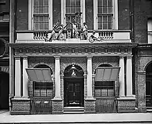 The building had been commissioned in 1757 by merchant banker Sir Charles Asgill as the sole premises of his private bank, engaging the services of architect Sir Robert Taylor to design the building. However, a decade after Asgill's death and after the 1796 closure of his bank,[2] it became an ideal location for Pelican. To adorn its building, Pelican added an allegorical sculptural group to the previously plain facade; the group was designed by Lady Diana Beauclerk and sculpted by John de Veere of the Coade Stone factory. The building was demolished in 1915, but the sculptural group is in the Horniman Museum, London.[3]