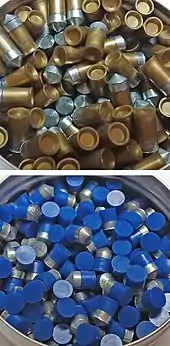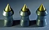 A pellet is a non-spherical projectile designed to be shot from an air gun, and an airgun that shoots such pellets is commonly known as a pellet gun. Air gun pellets differ from bullets and shot used in firearms in terms of the pressures encountered; airguns operate at pressures as low as 50 atmospheres,[1] while firearms operate at thousands of atmospheres. Airguns generally use a slightly undersized projectile that is designed to obturate upon shooting so as to seal the bore, and engage the rifling; firearms have sufficient pressure to force a slightly oversized bullet to fit the bore in order to form a tight seal. Since pellets may be shot through a smoothbore barrel, they are often designed to be inherently stable, much like the Foster slugs used in smoothbore shotguns.