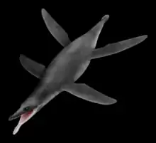 Plesiosaurs were well-adapted to marine life.[37][38][39] They grew at rates comparable to those of birds and had high metabolisms, indicating homeothermy[40] or even endothermy.[39] The bony labyrinth, a hollow within the skull which held a sensory organ associated with balance and orientation, of Peloneustes and other plesiosaurs is similar in shape to that of sea turtles. Palaeontologist James Neenan and colleagues hypothesised in 2017 that this shape probably evolved alongside the flapping motions used by plesiosaurs to swim. Peloneustes and other short-necked plesiosaurs also had smaller labyrinths than plesiosaurs with longer necks, a pattern also seen in cetaceans.[37] Additionally, Peloneustes probably had salt glands in its head to cope with excess amount of salt within its body. However, Peloneustes appears to have been a predator of vertebrates, which contain less salt than invertebrates, therefore leading palaeontologist Leslie Noè to suggest in a 2001 dissertation that these glands would not have had to be especially large.[41]: 257 Peloneustes, like many other pliosaurs, displayed a reduced level of ossification of its bones. Palaeontologist Arthur Cruickshank and colleagues in 1966 proposed that this may have helped Peloneustes maintain its buoyancy or improved its maneuverability.[42] A 2019 study by palaeontologist Corinna Fleischle and colleagues found that plesiosaurs had enlarged red blood cells, based on the morphology of their vascular canals, which would have aided them while diving.[38]