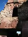 The church at Pemzashen has a small cruciform central-plan with a single intact octagonal drum above. Four small windows are located around the drum. The dome that once stood above has since collapsed, but the geometric cornice directly under where it stood is still intact. A side chapel is attached to the main church with a separate entry directly adjacent to the main portal to the church. Upon the lintel to the main entry to the church is a carving of the Virgin Mary holding the baby Jesus in her arms, and an angel to either side descending to Mary with child holding a cloth in their arms. Mary is flanked by two other figures with gifts in their hands. The angel and figure to the right have been defaced almost completely except for the angel's cloth, and the faces of all of the remaining figures have been defaced as well except for the figure standing to the right. The rear façades of the church and chapel are partially in ruin, and at one time there had been other rooms attached to the front façade of the structure, as is evident from the remnants of collapsed walls.