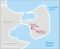 The Península Valdés Railway (in Spanish: Ferrocarril de Península Valdés) was an Argentine narrow gauge railway that joined the city of Puerto Pirámides with the salt evaporation pond known as Salinas Grandes, both in Chubut Province. The railway operated passenger and freight services, with two intermediate stops.