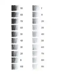As of 2021, a set of pencils ranging from a very soft, black-marking pencil to a very hard, light-marking pencil usually ranges from softest to hardest as follows: