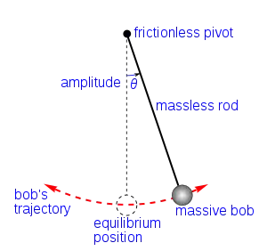 The simple gravity pendulum[4] is an idealized mathematical model of a pendulum.[5][6][7] This is a weight (or bob) on the end of a massless cord suspended from a pivot, without friction. When given an initial push, it will swing back and forth at a constant amplitude. Real pendulums are subject to friction and air drag, so the amplitude of their swings declines.