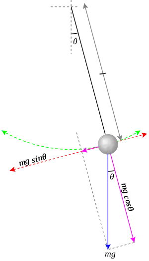 Consider Figure 1 on the right, which shows the forces acting on a simple pendulum. Note that the path of the pendulum sweeps out an arc of a circle. The angle θ is measured in radians, and this is crucial for this formula. The blue arrow is the gravitational force acting on the bob, and the violet arrows are that same force resolved into components parallel and perpendicular to the bob's instantaneous motion. The direction of the bob's instantaneous velocity always points along the red axis, which is considered the tangential axis because its direction is always tangent to the circle. Consider Newton's second law,