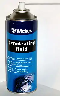 Penetrating oil, also known as penetrating fluid, is very low-viscosity oil. It can be used to free rusted mechanical parts (such as nuts and bolts) so that they can be removed, because it can penetrate into the narrow space between the threads of two parts. It can also be used as a cleaner; however, it should not be used as a general-purpose lubricant or a corrosion stopper. Using penetrating fluids as general-purpose lubricants is not advisable, because such oils are relatively volatile. As a result, much of the penetrating oil will evaporate in a short amount of time, leaving little residual lubricant.