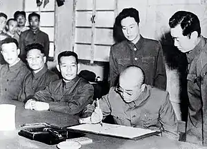 On July 27, 1953, Peng personally signed the armistice agreement in Panmunjom. At a mass rally in Pyongyang on July 31, Kim Il Sung awarded Peng his second North Korean "National Flag" Order of Merit, First Class (the first had been awarded to Peng in 1951) and awarded Peng the title of "Hero of the Korean Democratic People's Republic." Peng also received a hero's welcome in Tiananmen Square on August 11.[58] Chinese troops remained in North Korea until 1958.[59]