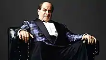 The Penguin appears in the 1960s Batman television series, in which he was portrayed by Burgess Meredith. Spencer Tracy was offered the role but he said he would only accept the role if he was allowed to kill Batman. Meredith's performance is perhaps best remembered for his signature laugh, meant to mimic the squawk of a penguin. (One cause of the laugh was the cigarettes the character always smoked, which irritated Meredith's throat as he was an ex-smoker.) His thugs wear black bowler hats and dark clothing adorned with names of various animals of prey, such as birds ("Hawk") or fish ("Shark"), or sometimes simply "Henchman". His prison cell is in the "Supervillains" section next to that of Joker, Riddler, Catwoman, Egghead, King Tut, and adjoining the cell of forger Ballpoint Baxter.[2] In one episode, he claims to have been an actor. In the theatrical film spin-off, he commands a submarine painted to resemble a penguin. His given name, Oswald Cobblepot, was never used in this series or the film; by Joker's subordinates, and even in criminal court, he is identified instead as "Mr. Penguin".[3] He occasionally uses "Mr. P. N. Guinn" as an alias.[4] Burgess Meredith also made a brief cameo appearance as the Penguin in the 1968 episode of The Monkees titled "Monkees Blow Their Minds".