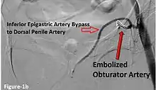 | This is the pre-embolization arteriogram showing the aberrant obturator artery arising from the inferior epigastric artery, which contributed to the described Penile Artery Steal Syndrome. |
