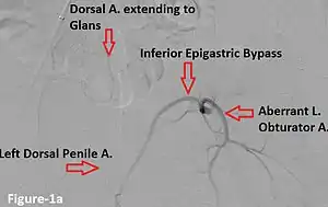 Penile Artery Shunt Syndrome (PASS) was initially described in a patient who underwent Penile Revascularization Surgery for isolated left cavernosal artery stenosis in the absence of systemic vascular risk factors. An end-to-end anastomosis of the left inferior epigastric artery to the left dorsal penile artery was created using a previously described technique.[3] After technically successful revascularization surgery, the patient continued to have post-operative erectile dysfunction despite documented patency of the surgical graft by Penile Duplex Ultrasonography. Pelvic angiography was performed on the patient, revealing an aberrant obturator artery originating from the inferior epigastric artery. The study revealed markedly sluggish forward flow visualized through the anastomosis to the left dorsal penile artery, with dominant flow in the left inferior epigastric artery to the obturator artery and its branches. This culminated in reduced blood flow to the penis.