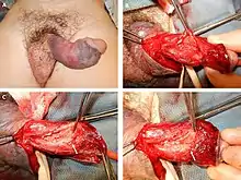 Amputation of the penis can be either partial or complete. Often self-inflicted by people with psychiatric disorders, it may be occur with other trauma, such as in an assault or a mechanical accident. These injuries are treated by re-implantation if possible, with or without anastomosis of the vasculature to restore erectile function; skin necrosis and loss of sensation are common complications after treatment. Microsurgery on the vasculature decreases the risk of necrosis significantly.[5] Klingsor syndrome is a psychiatric disorder that causes self-harm, which can involve the penis. Paranoid schizophrenia, eating disorders, and psychotic breaks can also be associated with penile injury.[6] In some cases, transgender people who are not able to access genital surgery may self-amputate their penis.[1] Favorable prognostic factors for replantation of amputated penises include short ischemic time and a clean incision (as opposed to a crush injury or ragged incision).[16]