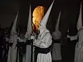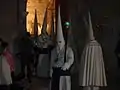 The habit of the brotherhood and its long caperuz, are white serge, to which is added a sash and purple edges. The brothers wear Franciscan sandals, carrying a black wood torch, with metal bowl and a red wax candle.[2][3]