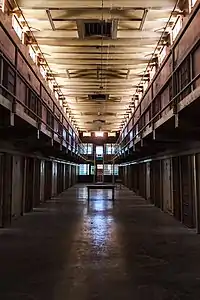 In 1980, Cell Block 4, at the far northern end from the Control Center, was the scene of one of the most violent prison riots in the correctional history of the United States. Over two days 33 inmates were killed and 12 officers were held hostage by prisoners who had escaped from crowded dormitories located at the southern end from the Control Center. Men were brutally butchered, dismembered, and decapitated and hung up on the cells and burned alive. This section of the prison was closed in 1998 and is now referred to as the "Old Main."[13]
