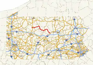 Pennsylvania Route 120 (PA 120) is a state highway in the U.S. state of Pennsylvania, running from U.S. Route 219 (US 219) in Ridgway east to US 220 near Lock Haven.[2]