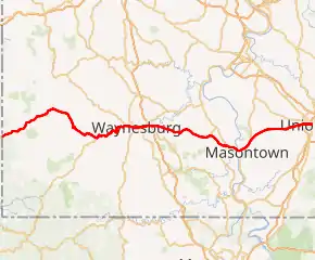 - PA 21 in Waynesburg (Map). Google Maps. Retrieved 2008-08-18.