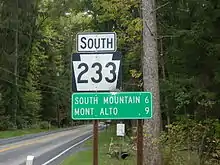 When routes were legislated in Pennsylvania in 1911, what is now PA 233 was designated as part of Legislative Route 191 between Dickinson and Green Park.[7] PA 233 was designated in 1928 to run from US 11 (Walnut Bottom Road) in Dickinson north to PA 33 (now PA 34) in Dromgold, following its current alignment north to Landisburg before it continued to the east. Upon designation, the route was paved between Dickinson and south of Doubling Gap while the remainder north to Dromgold was unpaved. In 1928, the road between Landisburg and Green Park was designated as part of PA 74, which was unpaved. At this time, the road between Mont Alto and US 30 was an unnumbered paved road.[8] By 1930, the section of PA 74 between Landisburg and Green Park was paved. By this time, the roadway between Pine Grove Furnace and Dickinson was an unnumbered unpaved road.[9] PA 233 was extended south from Dickinson to PA 997 in Mont Alto in 1937.[10][11] In 1937, PA 233 was realigned at Landisburg to head north to PA 17 in Ickesburg, following its current alignment to Green Park before continuing north to Ickesburg. The realigned PA 233 replaced a section of PA 74 between Landisburg and Ickesburg while the former alignment of PA 233 between Landisburg and Dromgold became part of an extended PA 850.[12] The entire length of the route was paved in the 1930s with the exception of a portion to the north of Doubling Gap.[11] In the 1940s, the north end of PA 233 was cut back to its current location at PA 274 in Green Park, with the section immediately to the north of PA 274 becoming unnumbered Green Park Road and the remainder of the road between north of Green Park and Ickesburg becoming a northern extension of PA 74. The section of the route north of Doubling Gap was paved and straightened in the 1940s.[13]