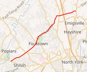 When routes were first legislated in Pennsylvania in 1911, the present-day alignment of PA 238 was not assigned a number.[4] By 1926, the current route was an unnumbered, unpaved road.[5] The present-day route was paved in the 1930s.[6] PA 238 was designated in the 1960s to follow its current alignment between PA 74 in Shiloh and PA 181 in Emigsville, with an interchange at I-83 to the west of Emigsville.[7]