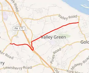 When Pennsylvania legislated routes in 1911, the portion of present-day PA 392 along Old Trail Road became part of Legislative Route 250, which ran between York and the Harrisburg area.[5] In 1920, this section of road became part of the Susquehanna Trail, an auto trail running between Baltimore and Williamsport, Pennsylvania.[6] The Susquehanna Trail was designated as PA 4 in 1924.[7][8] With the creation of the U.S. Highway System in 1926, US 111 became concurrent with PA 4 on the Susquehanna Trail, which was paved.[8][9] By 1926, Potts Hill Road and Yocumtown Road were unnumbered, unpaved roads.[10] The concurrent PA 4 designation was removed from US 111 in 1928.[11][12][13] Potts Hill Road and Yocumtown Road were both paved in the 1930s.[14] US 111 was realigned off Old Trail Road to the parallel I-83 to the west in the 1950s while Potts Hill Road was realigned to head south and intersect Old Trail Road.[15] PA 392 was designated in 1961 to run along its current alignment between PA 177 and PA 262 in order to provide a numbered route at the interchange with I-83 southwest of Yocumtown.[2]