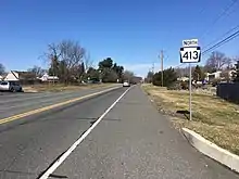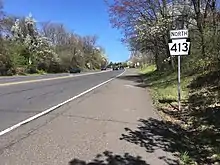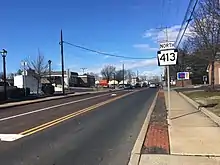 In 1946, the northern terminus of PA 413 was moved from Sellersville to the US 611 intersection in Pipersville. The former route between Sellersville and Pipersville became an extended PA 152 between Sellersville and Perkasie, unnumbered South Perkasie Road and Blooming Glen Road between Perkasie and Blooming Glen, and a rerouted PA 113 between Kulps Corner and US 611. In addition, the southern terminus was extended from Buckingham to US 13 in Bristol. The route replaced the entirety of PA 101 between Bristol and Penndel and part of PA 113 between Penndel and Buckingham.[10] By 1950, PA 413 was realigned to bypass Bath Road and Durham Road on its current alignment between Bristol and Penndel. In addition, the route was extended south from US 13 to the Burlington–Bristol Bridge, replacing PA 713.[11] In 1977, PA 413 was rerouted to bypass Newtown to the west on the Newtown Bypass.[12] The former alignment of PA 413 in Newtown followed State Street, Washington Street, Sycamore Street, and Durham Road.[13] In 1991, PA 332 and PA 532 were also routed to bypass Newtown following an extension of the bypass.[13][14] Also, the northern terminus of PA 413 at PA 611 was moved to its current location at Deep Run Road instead of where Durham Road intersected PA 611.[13]