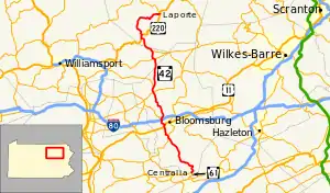 Pennsylvania Route 42 (PA 42) is a 58.6-mile-long (94.3 km) state route located in central Pennsylvania. The southern terminus of the route is at PA 61 in Centralia. The northern terminus is at U.S. Route 220 (US 220) in Laporte. The route heads north through Columbia County and passes through Catawissa before it crosses the Susquehanna River to Bloomsburg. In Bloomsburg, PA 42 forms a concurrency with US 11 and has an interchange with Interstate 80 (I-80). Past Bloomsburg, the route continues north through Millville and runs through the eastern part of Lycoming County. PA 42 heads into Sullivan County and runs concurrent with US 220 between Beech Glen and Muncy Valley before it loops west through Eagles Mere and reaches its terminus in Laporte.