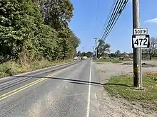 Pennsylvania Route 472 (PA 472) is a north–south state highway in Chester and Lancaster counties in Pennsylvania. Its southern terminus is at PA 841 in Lewisville 300 yards (270 m) north of the Maryland border. Its northern terminus is at PA 372 in Quarryville. PA 472 is a two-lane undivided road that passes through mostly rural areas along a northwest-southeast alignment. The route passes through the borough of Oxford, where it intersects the southern terminus of PA 10 and has an interchange with U.S. Route 1 (US 1). PA 472 was originally designated in 1928 between US 1/PA 12/PA 42 in Oxford and PA 372 in Quarryville. The route was extended south to Hickory Hill by 1930, at which time the entire length of the route was paved. The southern terminus of PA 472 was extended to PA 841 in Lewisville in 1937.