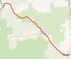 PA 607 begins at an intersection with PA 872 in the borough of Austin in Potter County, heading west on two-lane undivided Main Street. The road passes a mix of homes and businesses before it turns to the northwest and runs between wooded areas to the north and residential areas to the south. The route heads into forested areas of hills and leaves Austin for Portage Township, where it becomes an unnamed road. PA 607 enters Keating Township and continues northwest through rural land, passing through tracts of Susquehannock State Forest. Farther northwest, the road makes a curve to the west before a sharp turn to the south. PA 607 reaches its northern terminus at an intersection with PA 155 in the community of Keating Summit.[2][3]