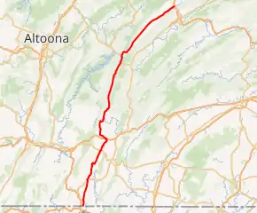 Pennsylvania Route 655 (PA 655) is an 83-mile-long (134 km) north–south state highway located in central Pennsylvania. The southern terminus of the route is at the Mason–Dixon line in Thompson Township, where the road becomes a local road (North Pennsylvania Avenue) in Hancock, Maryland. The northern terminus is at State Route 1005 (SR 1005), the former alignment of U.S. Route 322 (US 322), in Reedsville.