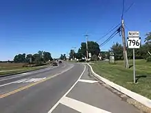 Pennsylvania Route 796 (PA 796) is a state highway in Chester County, Pennsylvania. The route runs 5.8 miles (9.3 km) from PA 896 in New London Township north to PA 41 in Londonderry Township. PA 796 heads through rural areas with some development along its route. In Jennersville, the route crosses Baltimore Pike and has an interchange with the U.S. Route 1 (US 1) freeway. PA 796 crosses PA 926 a short distance south of its northern terminus. PA 796 was originally designated by 1930 between the Maryland border near Kemblesville and north of Jennersville. In 1937, the southern terminus was moved to its current location, with PA 896 replacing the route south to the Maryland border, while the northern end was extended to PA 926 by 1940. PA 796 was extended north to PA 41 in the 1940s.