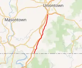 Pennsylvania Route 857 (PA 857) is an 11.04-mile-long (17.77 km) state highway located within Fayette County, Pennsylvania, United States. The southern terminus of the route is at the West Virginia state line southeast of Gans in Springhill Township, where the route continues south as County Route 857, a secondary state highway. The northern terminus is at an interchange with U.S. Route 119 and Pennsylvania Route 43 in Uniontown.
