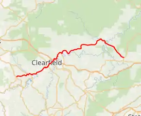 The route turns east onto two-lane divided limited-access Clearfield Shawville Highway and passes through wooded areas, skirting the southern border of the borough of Clearfield. PA 879 becomes undivided and turns to the northeast, passing through a section of Clearfield before heading back into Lawrence Township and coming to an interchange with PA 153, at which point it widens into a three-lane divided highway with two eastbound lanes and one westbound lane. The road briefly passes through Clearfield again before reentering Lawrence Township, becoming undivided again and curving to the north. The lane configuration changes to two westbound lanes and one eastbound lane as the route passes over Fire Tower Road and turns northeast again, coming to an interchange with US 322. Past this interchange, PA 879 crosses over a R.J. Corman Railroad line and the West Branch Susquehanna River, becoming a two-lane divided highway and passing through more wooded areas with some commercial establishments as a surface road. The median changes to a center left-turn lane as the road heads past more businesses and turns north to come to an interchange with Interstate 80 (I-80).[3][4]