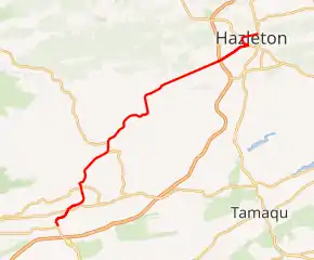 PA 924 crosses into Hazle Township in Luzerne County and continues east-northeast through forested areas with some commercial development. The road heads into the Humboldt Industrial Park and widens to four lanes, briefly becoming a divided highway as it crosses a CAN DO Inc. railroad branch line that serves the industrial park. The route becomes a five-lane road with a center left-turn lane and runs past more industry as it heads to the south of the Village of Humboldt. PA 924 passes businesses and becomes a four-lane divided highway, coming to an interchange with I-81. Past this interchange, the route passes to the north of the community of Harwood Mines and continues through wooded areas as the four-lane divided CAN DO Expressway. The road passes over Cranberry Creek and Norfolk Southern's Tomhicken Industrial Track railroad line before it bends east and becomes the border between the borough of West Hazleton to the north and the city of Hazleton to the south. PA 924 runs through woods between residential areas to the north and a coal mine to the south before it comes to an intersection with PA 93. Here, the route turns northwest to form a concurrency with PA 93 on four-lane undivided Broad Street, running past homes in West Hazleton. The road turns to the north before PA 924 splits from PA 93 by heading east on two-lane Washington Avenue. The route passes residences and a few businesses, crossing into the city of Hazleton and becoming West 15th Street. PA 924 continues through developed areas of the city and reaches its northern terminus at an intersection with PA 309.[2][4]