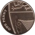 In August 2005 the Royal Mint launched a competition to find new reverse designs for all circulating coins apart from the £2 coin.[24] The winner, announced in April 2008, was Matthew Dent, whose designs were gradually introduced into circulating British coinage from mid-2008.[25] The designs for the 1p, 2p, 5p, 10p, 20p and 50p coins depict sections of the Royal Shield that form much of the whole shield when placed together. The entire shield was featured on the now-obsolete round £1 coin.[26] The 1p coin depicts the left section between the first and third quarter of the shield, representing England and Northern Ireland. The coin's obverse remains largely unchanged, but the beading (the ring of dots around the coin's circumference), which no longer features on the coin's reverse, has also been removed from the obverse.[27]