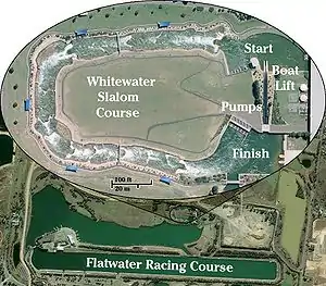 As the course has been built in a relatively flat area (flood plain), it has been built up and landscaped to create the sloping course necessary for the required rapids. Five of the six available 300-kilowatt pumps lift the water from the bottom to the start of the course, at the rate of 14 m³/s.