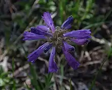 The glandular inflorescence is made up of 1 to 6 separate clusters of dark purple-blue tubular flowers each just over a centimeter long. The outer surface of the flower generally has glandular hairs, and on the inside there are hairs on the floor of the flower mouth and on the staminode.