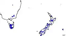 P. pumila occurs in areas above the treeline in cushion bogs, open snow tussock grasslands, and herbfields in Australia (Tasmania, Victoria, and New South Wales) and New Zealand (North, South, and Stewart Island).[9] It is widely distributed through both countries in the aforementioned states, though less so in the North Island of New Zealand and New South Wales in Australia.[10] It frequently grows in exposed, rocky sites or in poorly drained, peaty areas, and is commonly found on the nests of ants (genus Ochetellus).[11] It is often confused with Cyathodes dealbata, which is similar in appearance and growth habit, though can be distinguished by the glaucus veins on the underside of leaves, which is not evident on P. pumila.[12]