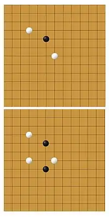 A stretch tria is a shape formed by a single stone placed in line with a pair of stones and a single empty space between them. The stretch tria is vulnerable to counter because an opponent can place a stone between the single stone and the pair and threaten capture. It is powerful however because it threatens to form a tessera, and if unbound on either side forces the opponent to respond in a similar way to open tria, creating initiative and allowing play elsewhere on the board without the opponent interfering. The stretch tria can be a very powerful tool when used in conjunction with other stretch trias. A vertical stretch tria with the pair at the top and the single stone at the bottom can be combined with another stretch tria in a diagonal or horizontal line so that both stretch trias share the same single stone. If an opponent tries to stop one of them, then the very next turn, the player who formed the stretch tria can extend the other and turn it into a tessera. If the tessera is unbound the position is likely a winning one[31]