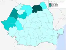 The Pentecostal Union of Romania (Romanian: Uniunea Penticostală din România) or the Apostolic Church of God (Romanian: Biserica lui Dumnezeu Apostolică) is Romania's fourth-largest religious body and one of its eighteen officially recognised religious denominations. At the 2011 census, 367,938 Romanians (1.9% of the population) declared themselves to be Pentecostals.[2] Ethnically, as of 2002, they were 85.2% Romanians, 10.6% Roma, 1.9% Ukrainians, 1.8% Hungarians and 0.5% belonged to other groups.[3] They have 1,343 churches, 7,879 affiliates and 354 pastors,[4][5] along with strong lay leadership.[6] The denomination originates in the early 1920s and, headed by a central leadership, is divided into nine regional communities: Arad, Braşov, Bucharest, Cluj-Napoca, Constanţa, Oradea, Oltenia-Argeş (Craiova), Maramureş-Sătmar (Baia Mare) and Suceava.[7] Membership is concentrated in Crişana, Banat and northern Moldavia.[4]