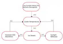 Much like the last glacial period, the penultimate glacial period was caused by a great orbital eccentricity of Earth.[5] This eccentricity causes greater seasonal impacts than normal because it limits the amount of sunlight that reaches the earth’s surface, lowering the temperature.[6] Due to this, northern insolation (the amount of sunlight that reaches the surface) is reduced, this means when it's summer, less heat is exposed to the snows of the winter, which don't completely melt.[2] This buildup of ice and snow over thousands of years eventually leads to residual ice sheets, which would also reflect light away from the earth, further cooling the earth.[7] A decrease in greenhouse gas concentrations such as CO2, are a result of the expanded ice sheets.[5] This is because as the Earth cooled, and ice sheets expanded, the ocean waters became colder, which then could absorb more CO2 from the atmosphere.[8] These factors all feedback into each other: as the ice sheets extended, more CO2 was absorbed, and more light was reflected off the ice sheets, furthermore expanding the ice sheets, this self-reinforcing cooling setting the world into a glacial period.[8]