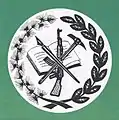 First adopted in 1976 and modified in 1977-78, the PLA official emblem consisted of a red flag with a white disc on the centre, featuring a crossed dip pen and pickaxe superimposed on an AK-47 assault rifle in the middle standing upwards, all in silver, inserted on a golden circular wreath, the latter consisting of two interlocking branches and leaves of the Oak tree and the Lebanese Cedar tree.[1]