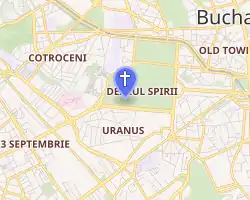 The People's Salvation Cathedral (Romanian: Catedrala Mântuirii Neamului), also known as the National Cathedral (Romanian: Catedrala Națională), is an Orthodox cathedral under construction in Bucharest to serve as the patriarchal cathedral of the Romanian Orthodox Church.[22] It is located in central Bucharest on Spirea's Hill (Arsenal Square), facing the same courtyard as the Palace of Parliament which is the heaviest building in the world,[23] the cathedral having a tenth of its weight and about 24% of its volume.[1] Situated behind the Palace of Parliament, this will make it 50 metres taller than the Palace, and will help to make the cathedral an iconic landmark in the city.[24] The People's Salvation Cathedral is 86.2 metres (283 ft) above sea level, and at 135 metres (443 ft) height (ground-cross), holds a dominant position in Bucharest's cityscape, being visible from all approaches to the city.[12][13]